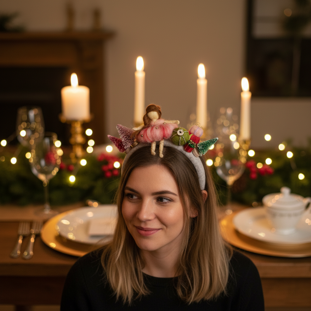Add a sprinkle of festive magic to your celebrations with our Handcrafted Felted Christmas Fairy Headband Collection — a joyful blend of artistry, playfulness, and holiday spirit. Each headband features a unique, hand-felted fairy perched among miniature Christmas trees, sparkling gifts, and seasonal details, creating a wearable piece of art that celebrates the wonder of the holidays.