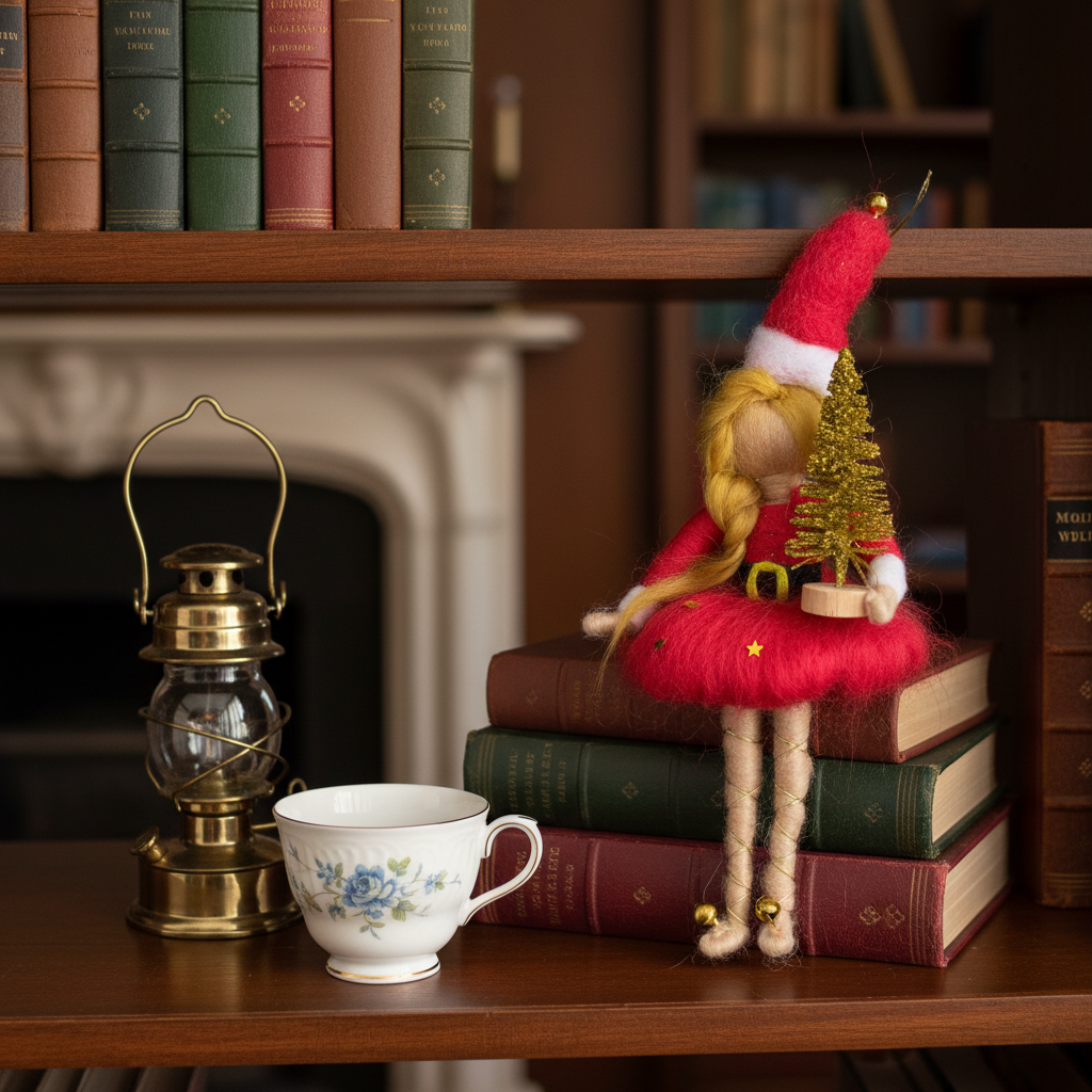 This cheerful fairy wears a bright red wool dress trimmed with white, complete with a tiny belt and matching Santa hat topped with a golden bell. In her hands, she carries a glittering gold Christmas tree and a stack of miniature presents — ready to spread joy wherever she goes.